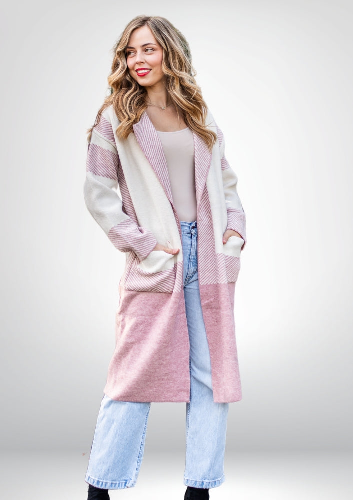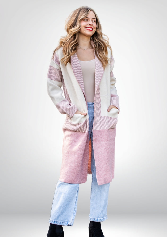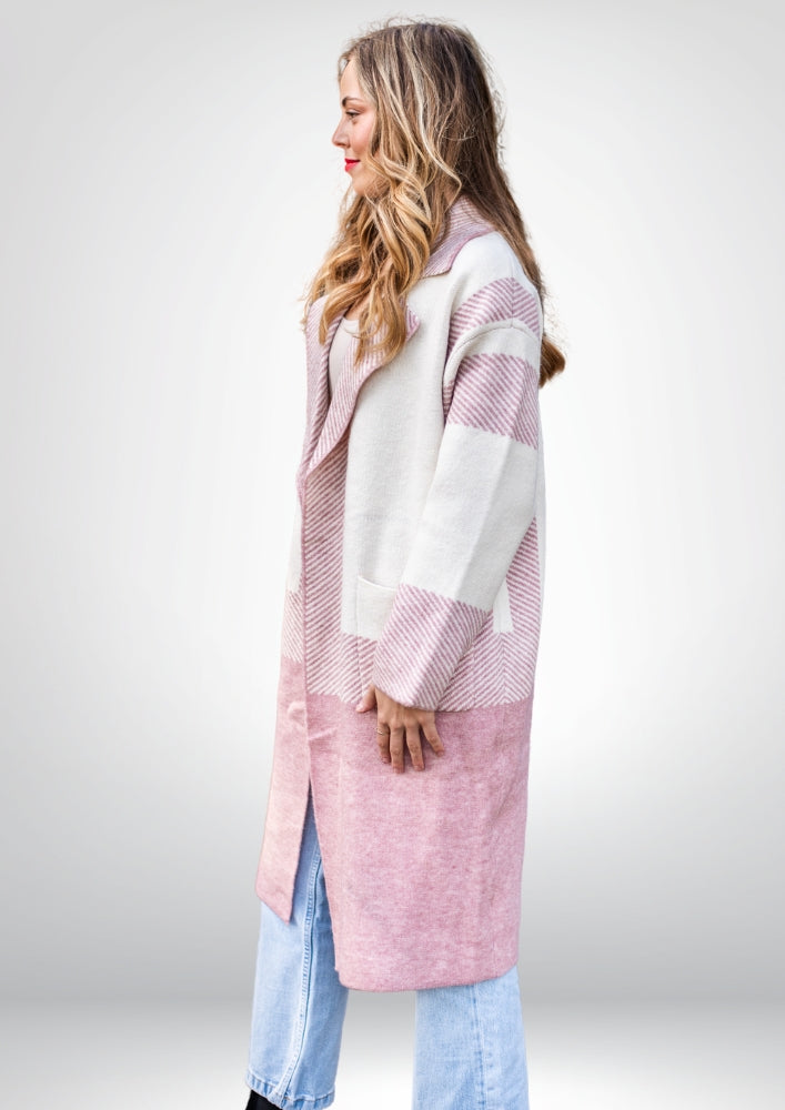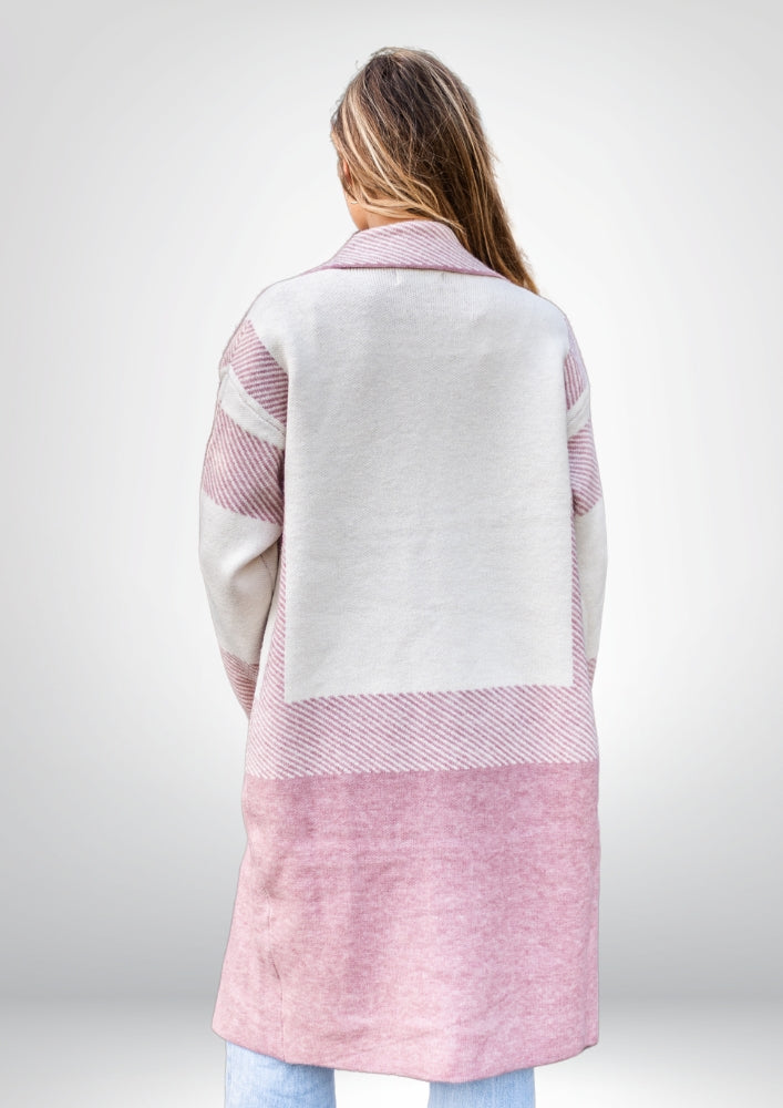 Elevate your wardrobe with the Kiera Coatigan in Rose, a refined blend of coat and cardigan designed for effortless sophistication. Its soft, warm fabric offers comfort while the elegant rose hue adds a subtle touch of color, perfect for layering over any ensemble. Ideal for transitional weather, this versatile piece combines style and practicality with a polished finish.
