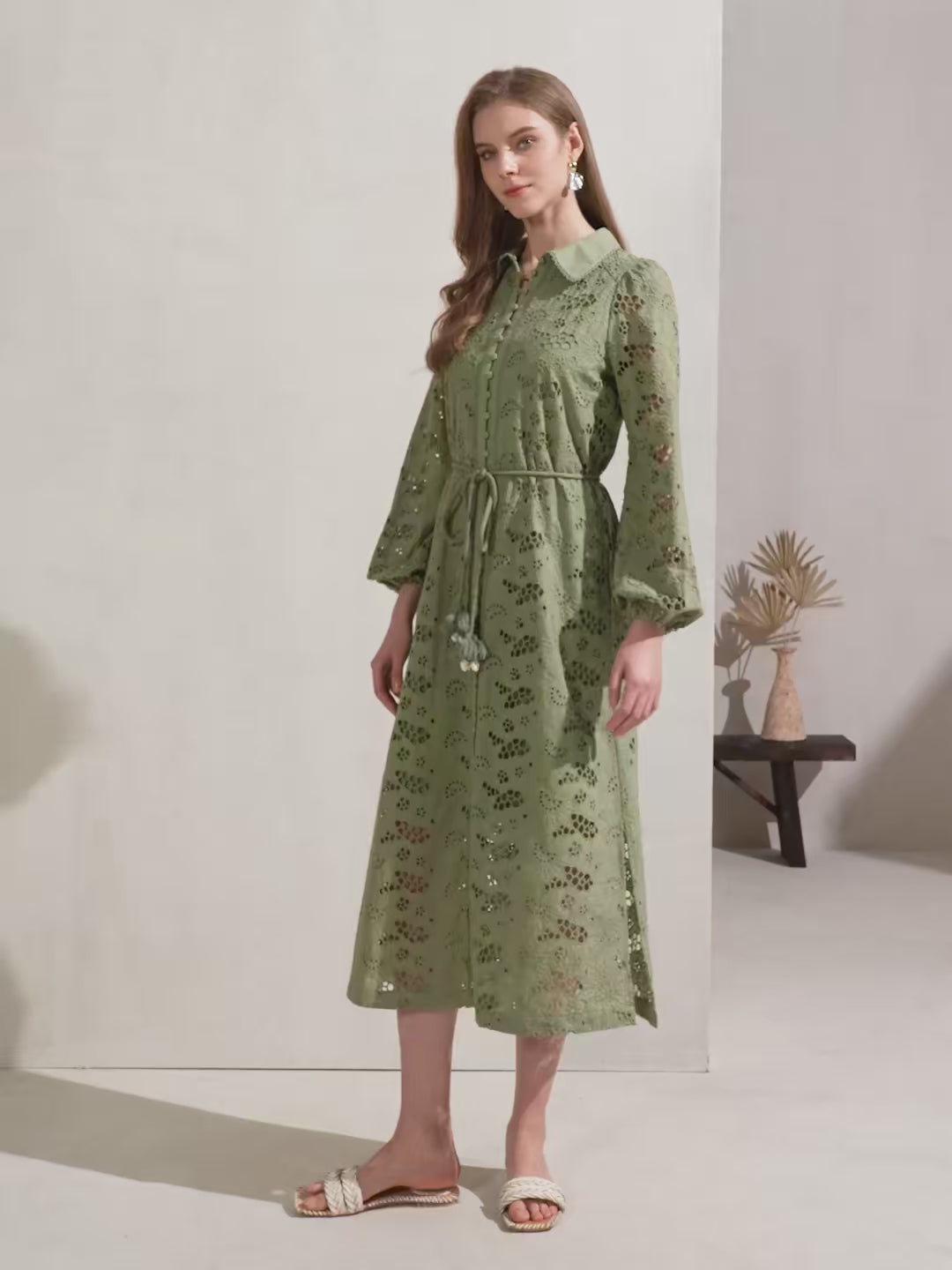 Imagine wearing this elegant dress to a charming outdoor garden party. The long, flowing silhouette and intricate embroidery perfectly complement the natural beauty of a garden setting. Surrounded by blooming flowers and lush greenery, you'll feel effortlessly chic and comfortable. The breathable cotton fabric keeps you cool, while the elegant design ensures you stand out in style.