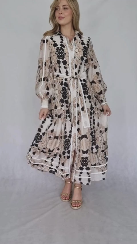 This maxi dress features a striking and sophisticated print that combines abstract shapes with floral motifs in shades of black, beige, and cream. The design is both modern and elegant, with a slightly graphic feel. The dress has long sleeves with subtle puffing at the shoulders, a collared shirt neckline, and a defined waistline cinched with a self-tie belt. A black trim along the seams adds a touch of contrast and definition. The dress falls in a tiered, flowing silhouette, creating a romantic and graceful look. The fabric is lightweight and possibly sheer, suggesting a comfortable and breezy feel. The overall style is effortlessly chic and perfect for a variety of occasions.
