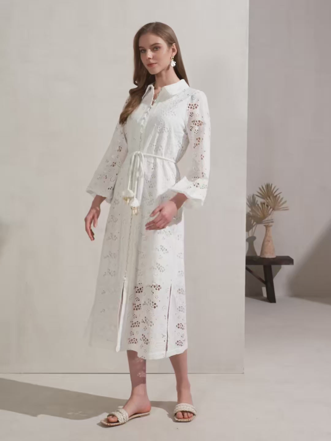 Imagine wearing this elegant dress to a charming outdoor garden party. The long, flowing silhouette and intricate embroidery perfectly complement the natural beauty of a garden setting. Surrounded by blooming flowers and lush greenery, you'll feel effortlessly chic and comfortable. The breathable cotton fabric keeps you cool, while the elegant design ensures you stand out in style.