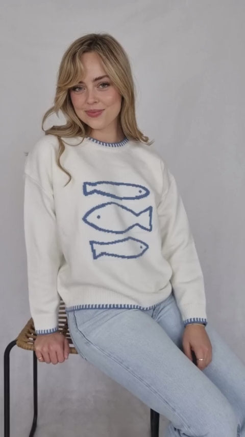 This charming white-blue jumper features a playful and subtly nautical design. Three simple blue fish are embroidered on the front, adding a touch of whimsy to the classic crewneck style. The relaxed fit and long sleeves provide both comfort and style, making it a versatile piece for casual wear. The subtle blue stitching around the neckline and hem adds a finishing touch.