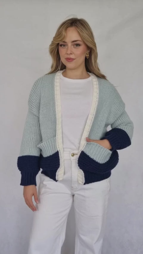 Indulge in luxury with our Sage Cardigan in Blue. The soft mint green and deep navy blue color-blocked design creates a visually stunning contrast. This cozy cardigan features a relaxed fit, chunky knit, and front pockets for practicality. A touch of elegance is added with the cream-colored trim. Elevate your wardrobe now.