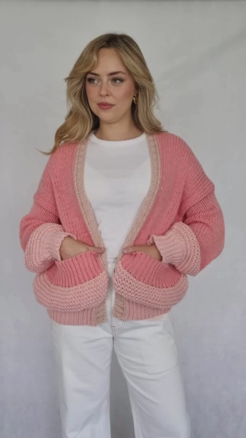 This cardigan is a lovely blend of cozy and chic. The soft, blush pink knit creates a delicate and feminine look, while the slightly oversized fit adds a touch of casual comfort. The contrasting lighter pink trim on the cuffs and pockets provides a subtle yet stylish detail. It's a versatile piece perfect for layering or wearing on its own.